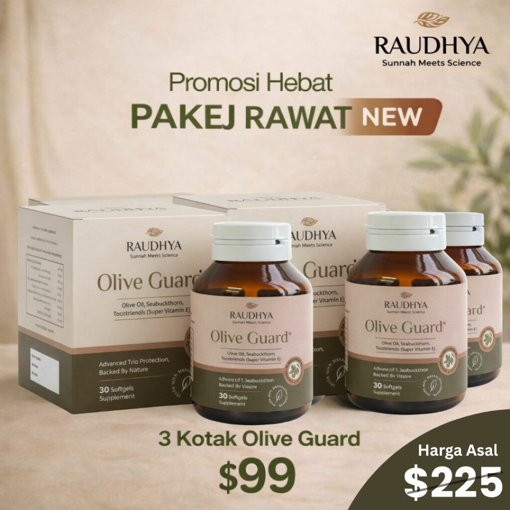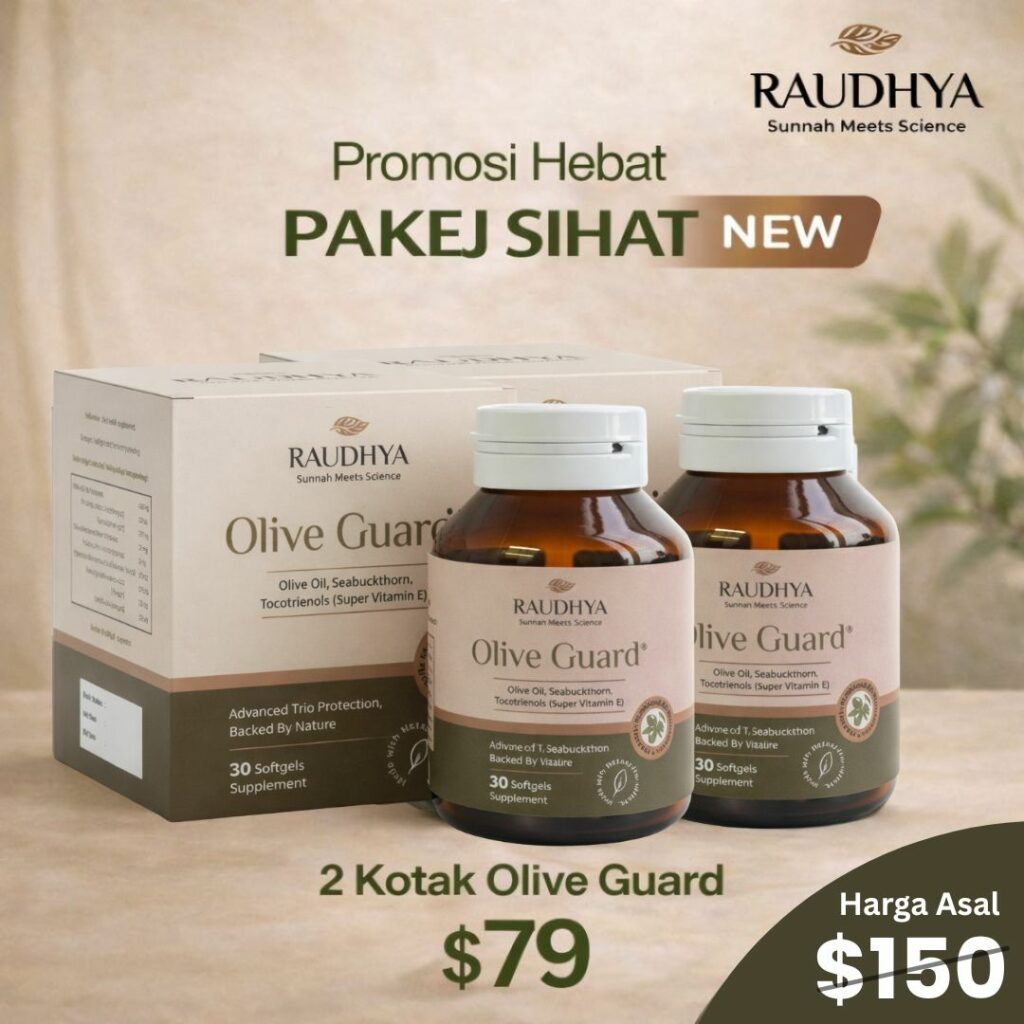 Raudhya OliveGuard+ Diperkaya Bahan Aktif Polyphenols, Tocotrienols (Super Vitamin E) & Omega Aktif Menyokong Kawalan Gula, Kolesterol & Tekanan Darah